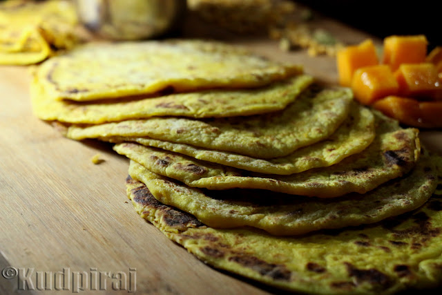 "Why Mango Puran Poli? Are you sure it will taste good?" asked my wife Meena. I smiled and told her, "Puran Poli is relished with aamras or Mango Seekarane/Rasaayana in some parts of Karnataka. Why not combine mango with Puran Poli stuffing and come out with Mango Puran Poli?"